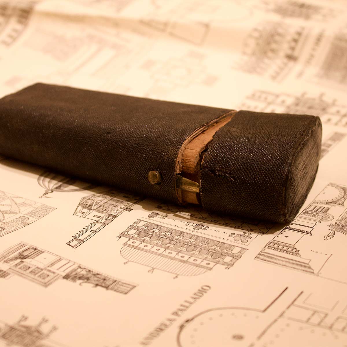 Set di strumenti da disegno con custodia originale in legno di balsa e galuchat, strumenti in ferro, ottone e avorio